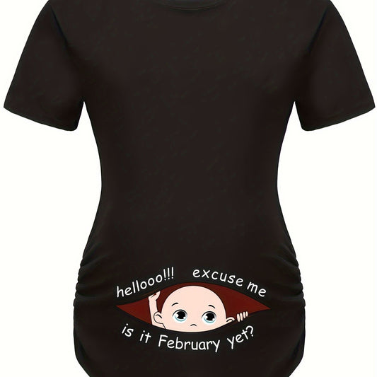 Hello Month & Cartoon Character Print Maternity T-Shirt, Round Neck Short Sleeve Pregnant Women's Top For Pregnancy Announcement - Comfortable Fit