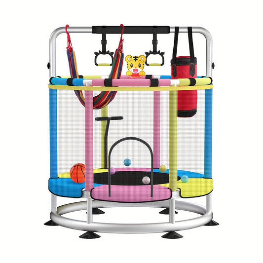 Trampoline For Kids, Update T-handrail Adjustable Trampoline With Basketball Hoop, 440lbs Anti-Rollover Round Bottom Indoor Outdoor Trampoline With Enclosure