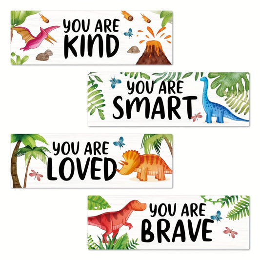 Putuo Decor 4pcs Inspirational Quotes Wooden Signs - "You Are Kind, Smart, Brave, Loved" with Cute Dinosaur Wall Art for Home, Nursery, Youngsters's Room, Bedroom, Kindergarten - 11.8x3.9 Inches