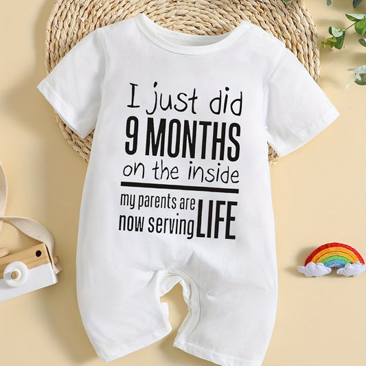 Adorable 'I Just Did 9 Months' Letter Print Baby Romper - Soft Polyester Blend, Short Sleeve Jumpsuit for Boys & Girls, Perfect for Spring/Summer, Baby Clothes, Perfect for Outdoor