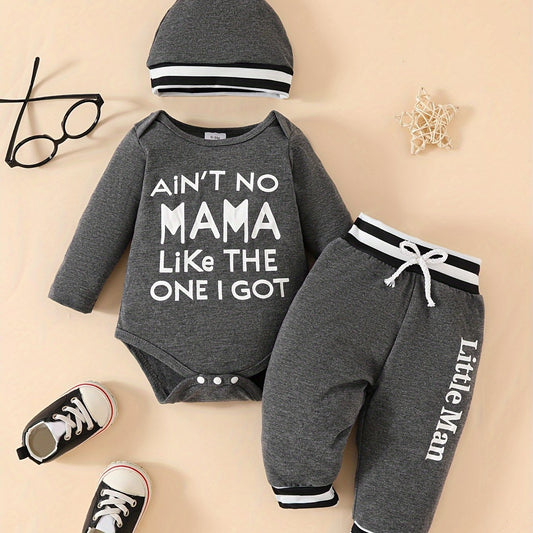 Long-sleeved letter-printed shirt + striped trousers + hat three-piece set