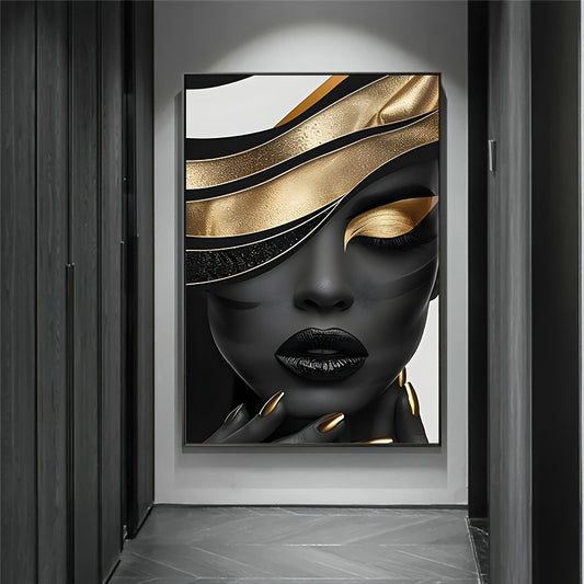 1pc Modern Fashion Canvas Wall Art - Wooden Framed Black & Golden Abstract Face Design, High-Quality Ready-to-Hang Home Decor for Living Room, Bedroom, Bathroom, Kitchen - Holiday Gift for Halloween, Christmas, Birthdays, Room Decor