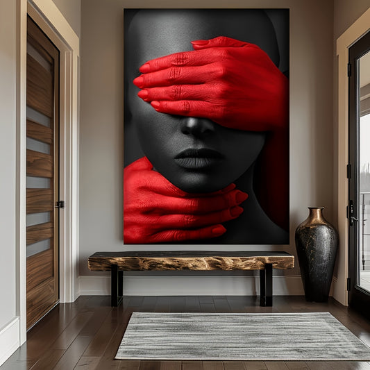 [Vibrant Red | Modern] Vibrant Red & Black Wood Framed-Modern African Woman & Red Hand Canvas Art Print | Wall Decor for Home, Office, Cafe | 2D Flat, Perfect for Room Decor