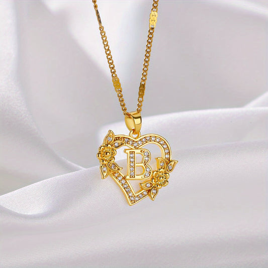 Elegant 14K Golden Plated Copper 1pc Heart Pendant Necklace - Synthetic Zirconia, Boho Style Hollow Letter Clavicle Chain for Women - Perfect for Daily Wear & Parties, Ideal Valentine'S Day Gift