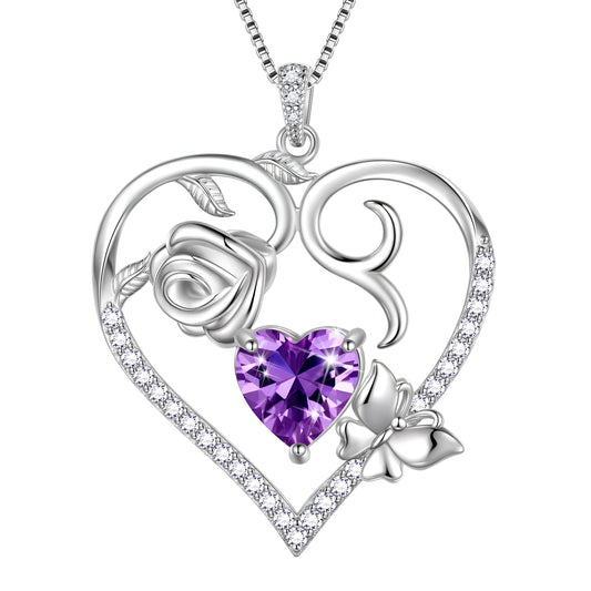 Beautlace 925 Sterling Silver Heart Rose Necklace,Butterfly Flower Cute Animal Pendant Necklace Jewelry Birthday Christmas Valentines Gifts for Women -June