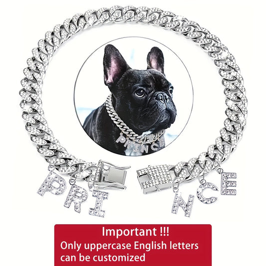 Sparkling Personalized Dog Necklace, Customized Dog Collar With Letter Pendant Tag - Rhinestone 13mm Dog Cuban Chain, With Double Lock Design Collar