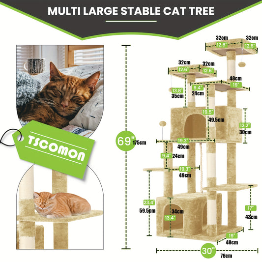 TSCOMON 69/24 Inch Deluxe Cat Tree - Multi-Level Plush Cat Condo with 2 Perches, 2 Soft Fiberboard Cozy Caves, 5 Cat Scratching Posts, 3 Hanging Ball Toys - Easy to Assemble, Sturdy, Suitable for Kittens & Cats with Anti-tilt Device, Indoor Cat Furniture