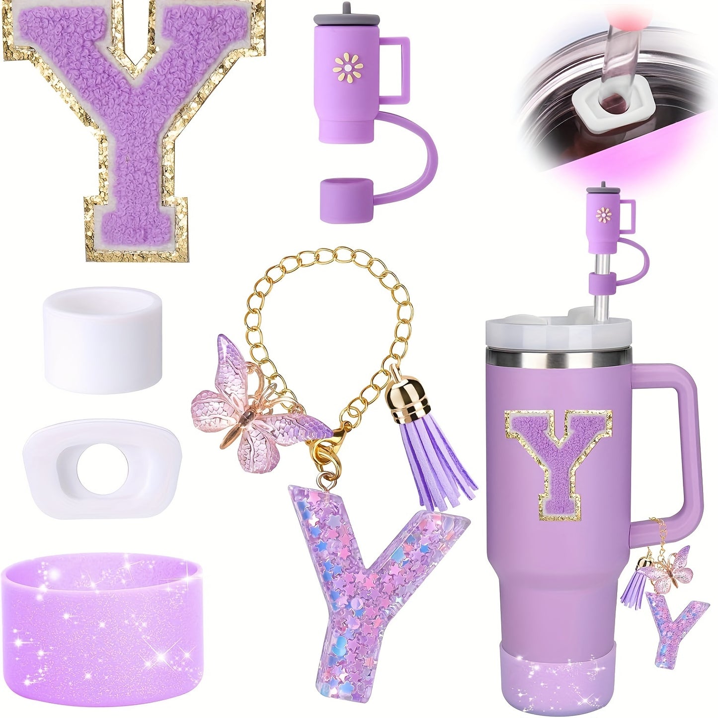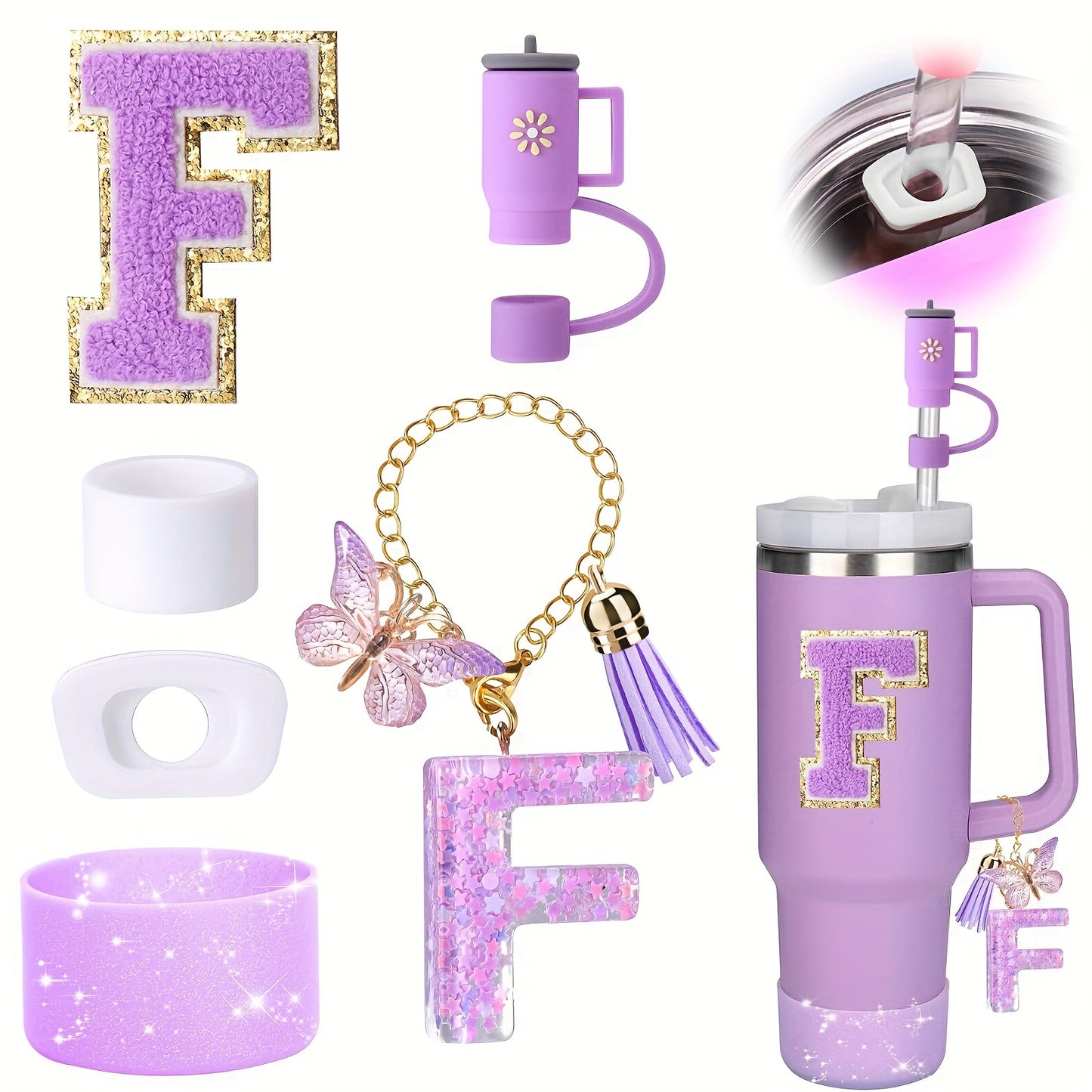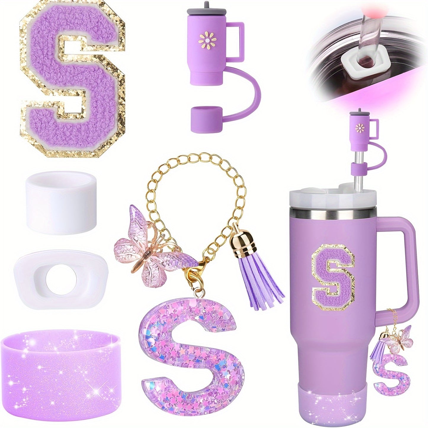 [6pcs Customizable Water Bottle Accessory Set] 6pcs Silicone Water Bottle Accessory Set, Customizable with Initial Letter M, Includes Straw Topper, Splash Stopper, Handle Charm, and Decal - Fits Standard Bottles (Cup Not Included)