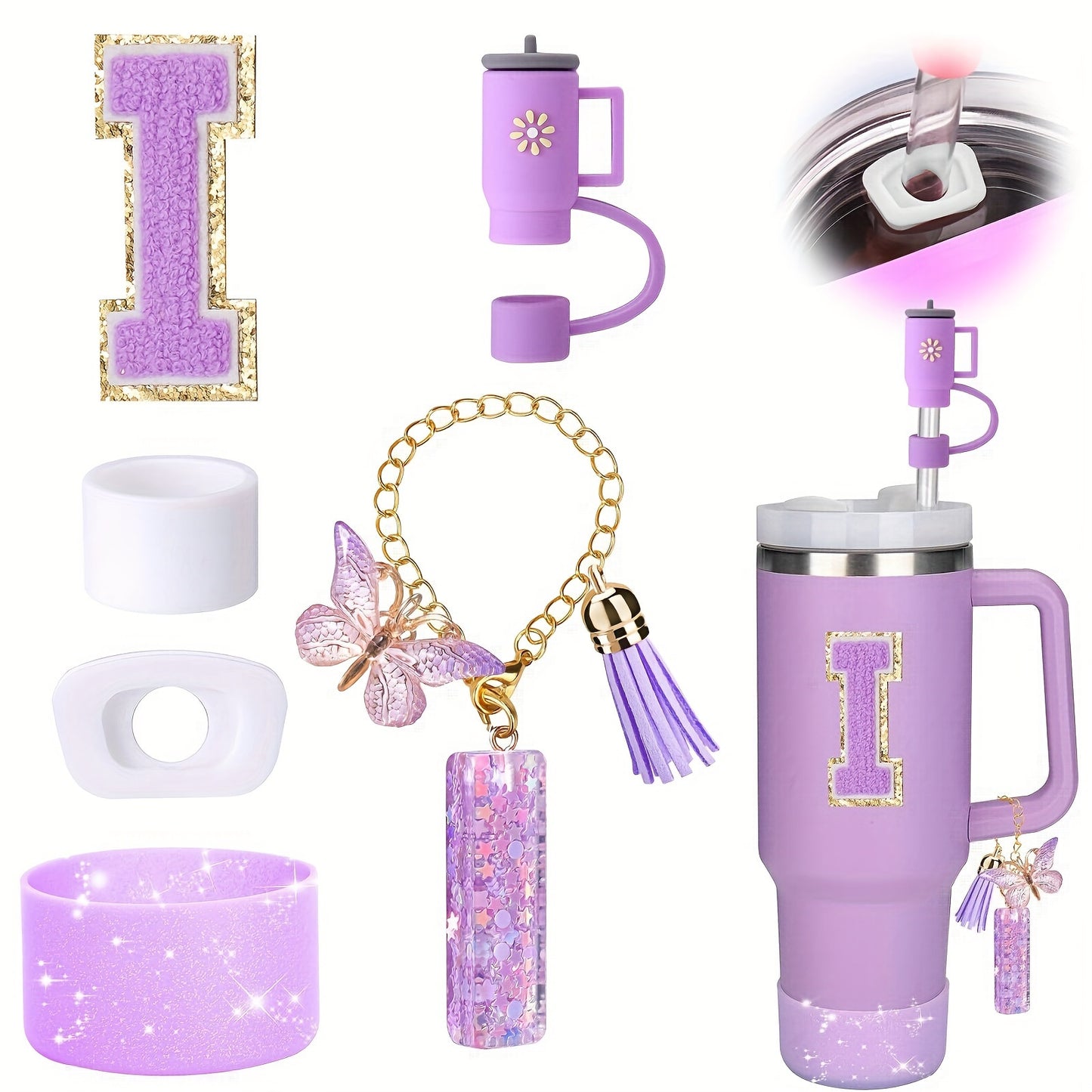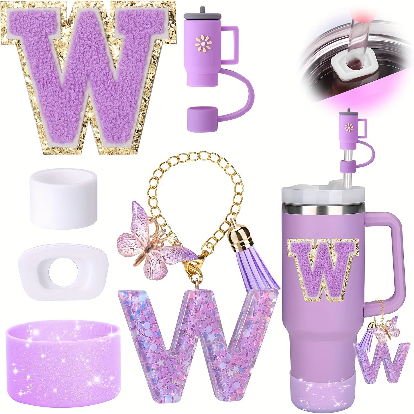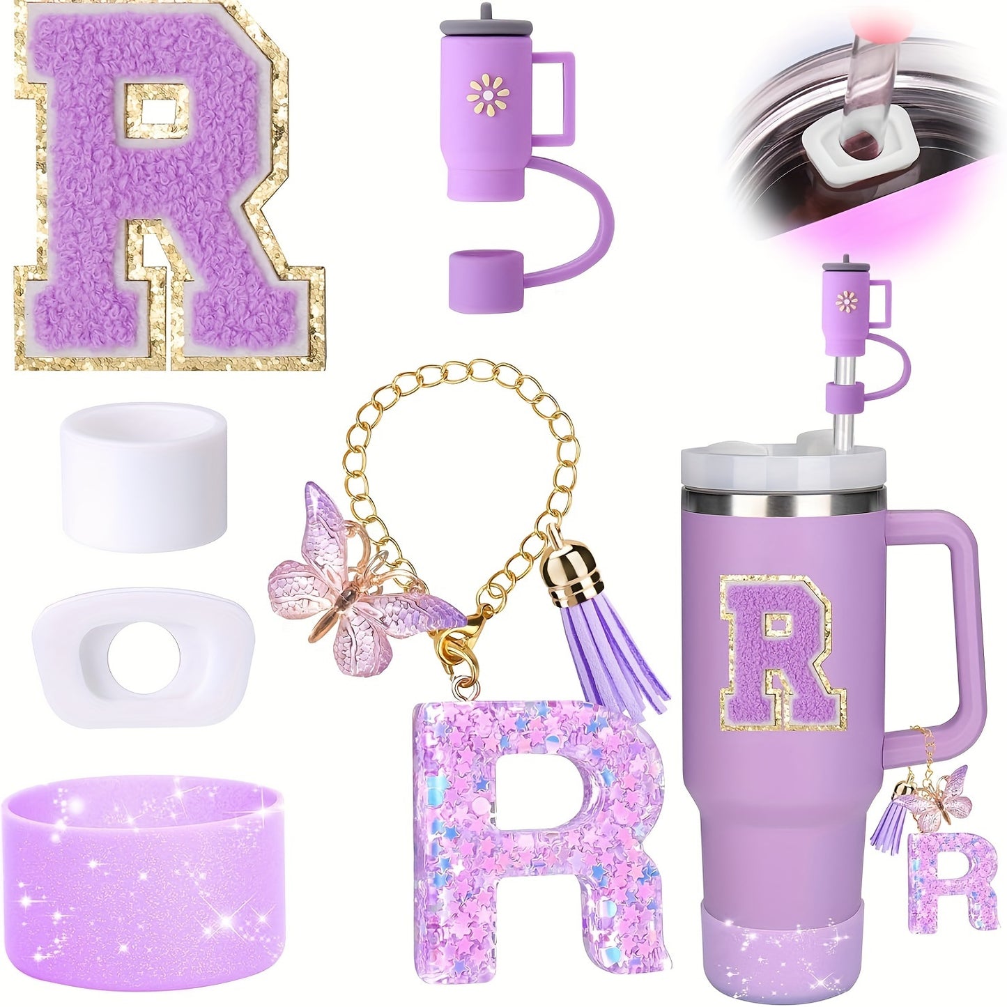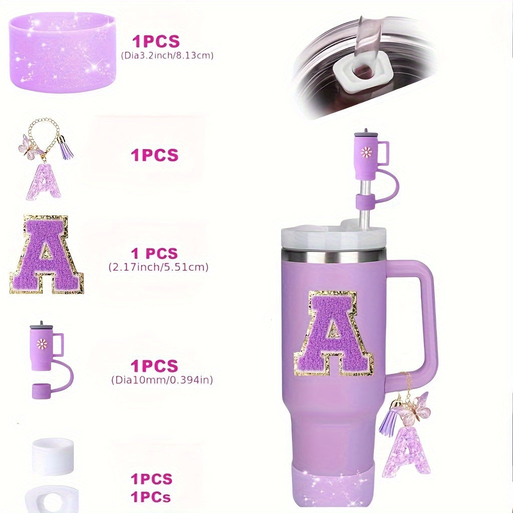 [6pcs Customizable Water Bottle Accessory Set] 6pcs Silicone Water Bottle Accessory Set, Customizable with Initial Letter M, Includes Straw Topper, Splash Stopper, Handle Charm, and Decal - Fits Standard Bottles (Cup Not Included)