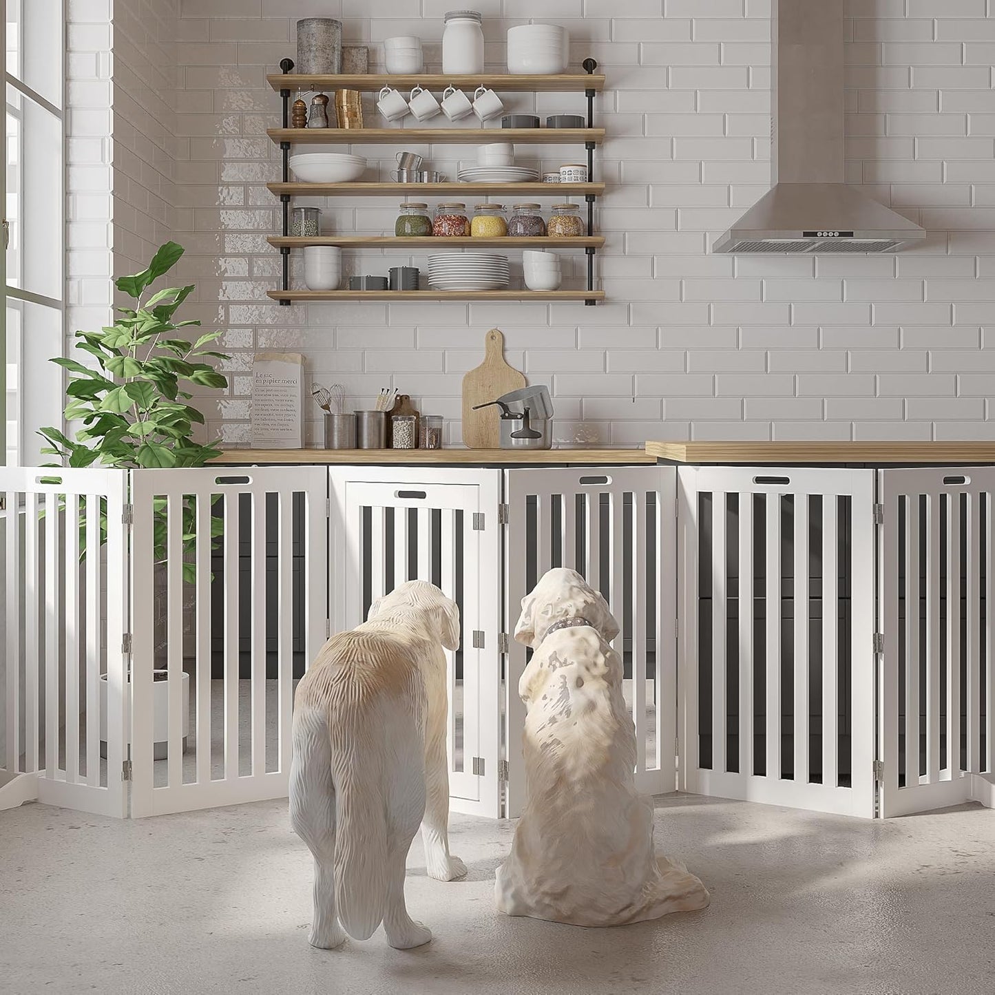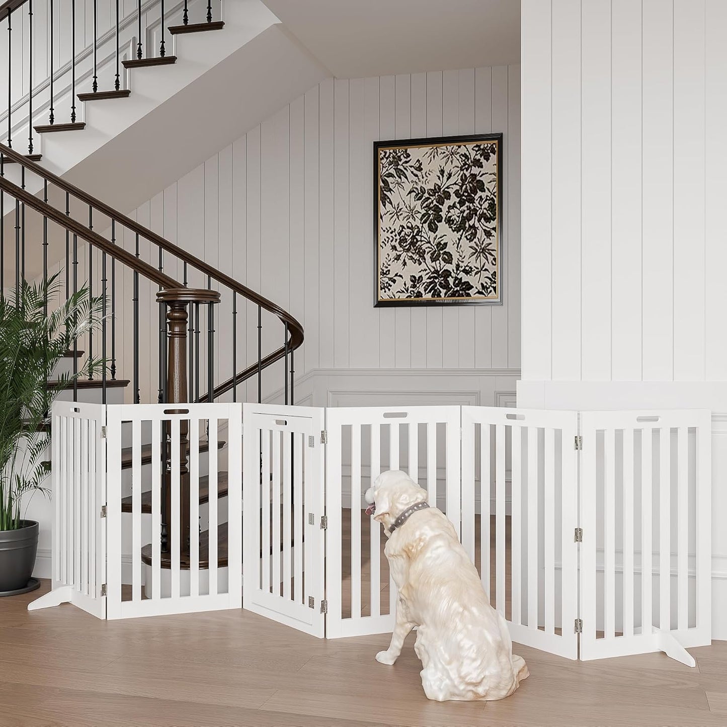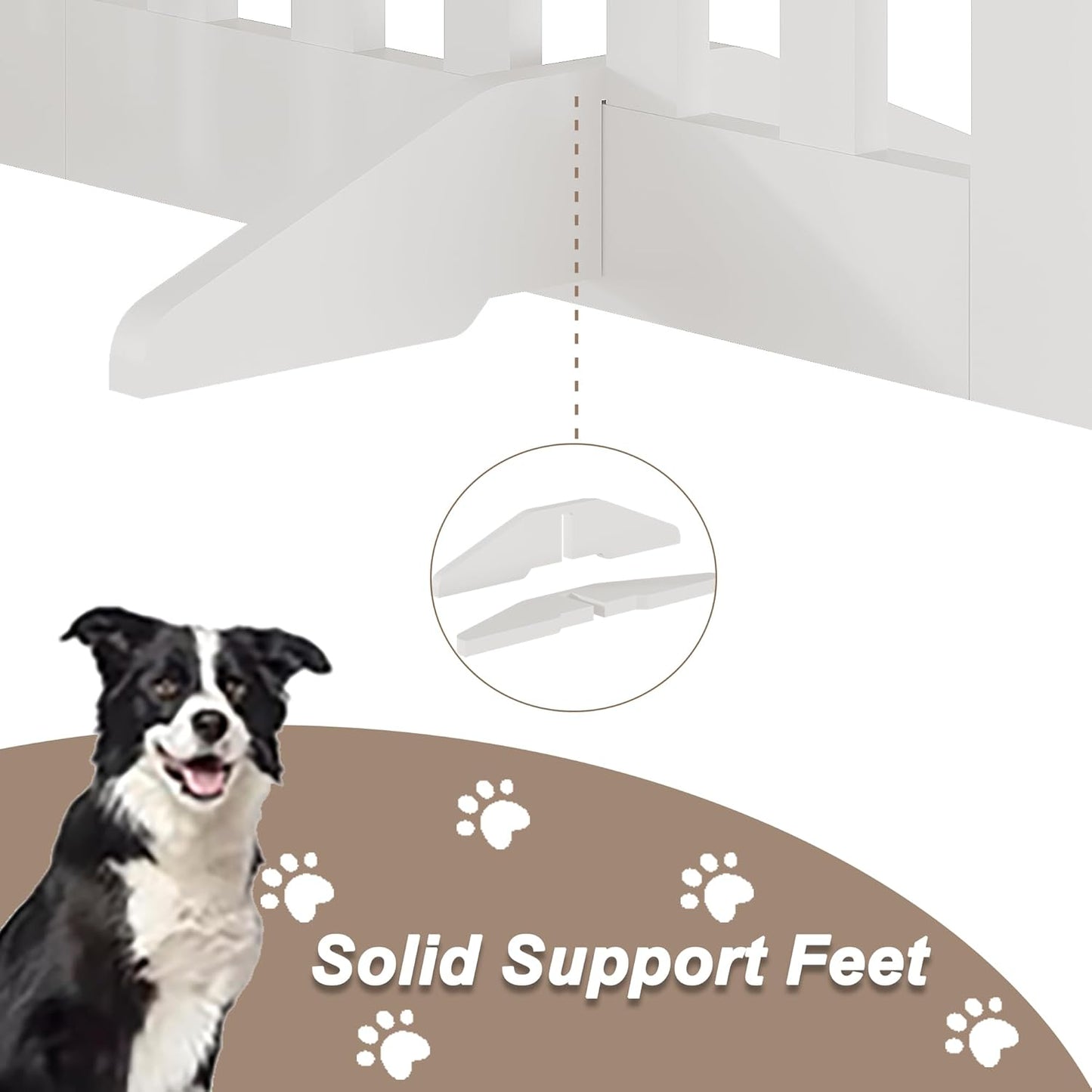 【Minimalist Modern Design】: The pet gates for dogs with door design are fashionable, generous, and practical, with a white appearance that easily complements most furniture decoration styles. The wooden strips have a certain spacing, which effectively protects the dog from entering and does not obstruct the view, making the dog uneasy.