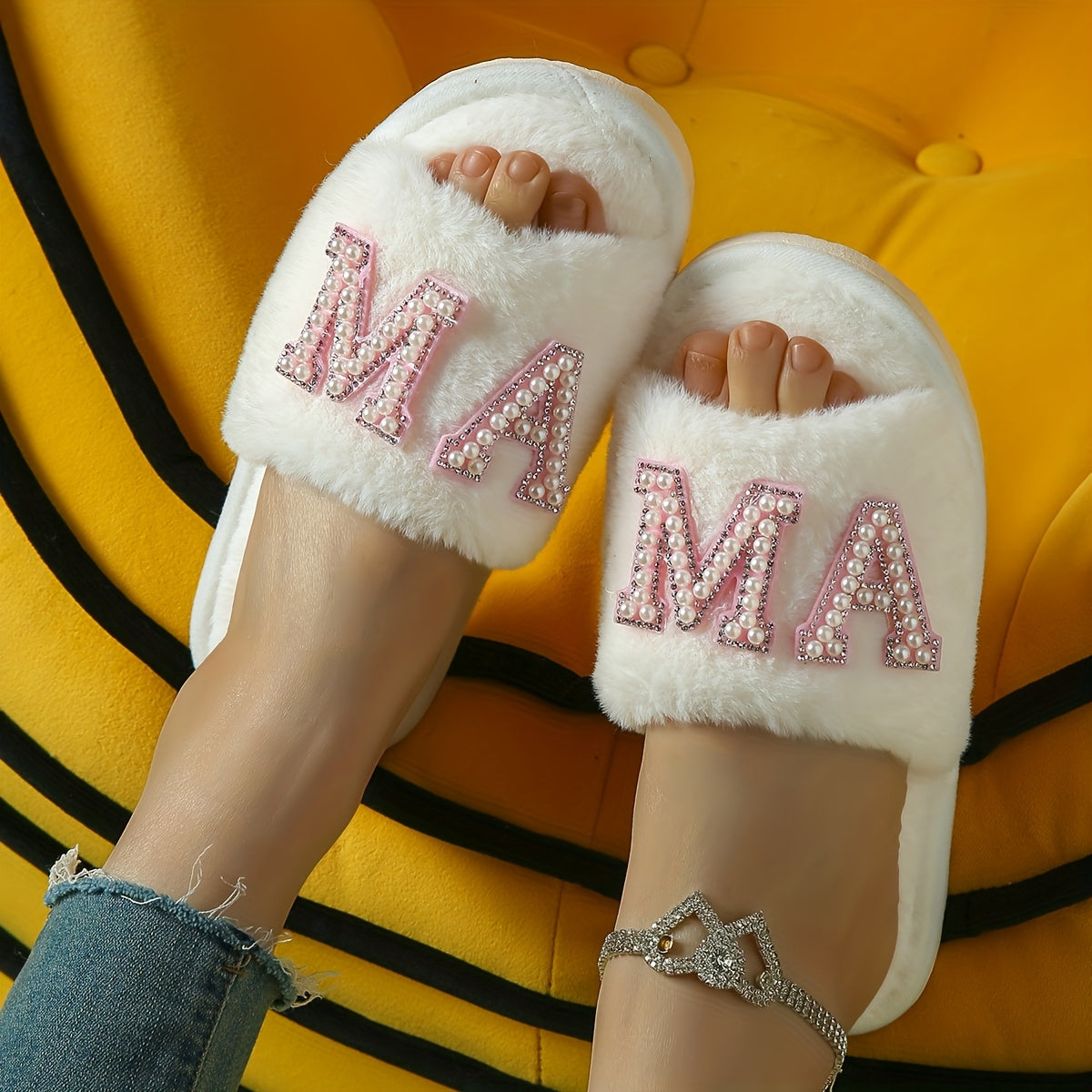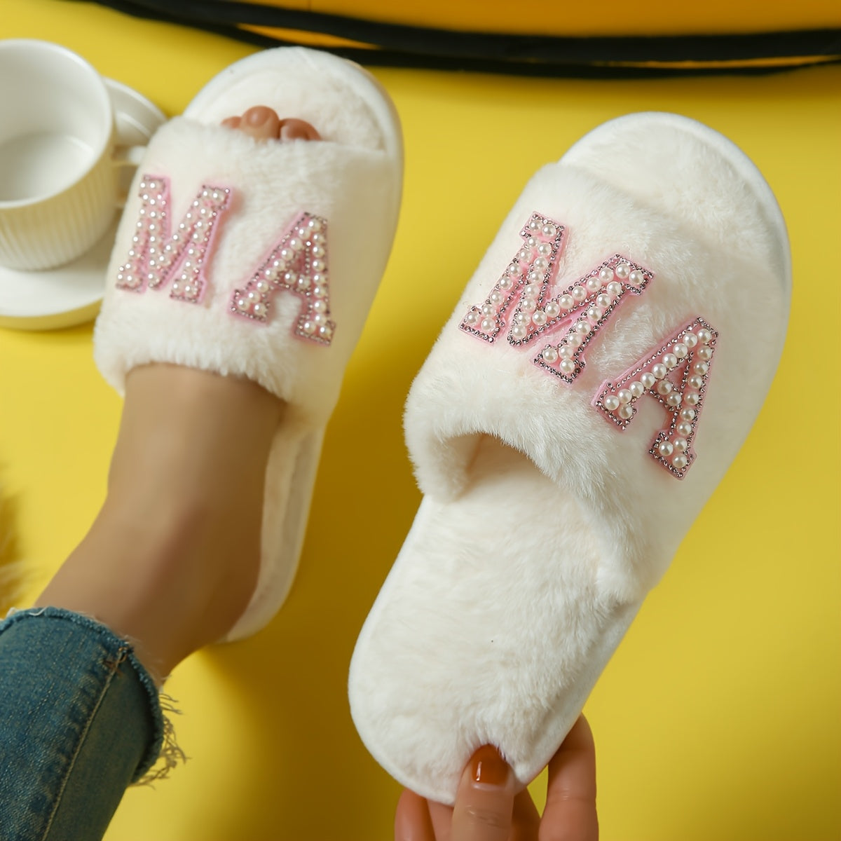 [Cozy Slippers] Soft Cozy Plush 'Mama' Slippers | Breathable, Non-Slip Indoor House Shoes for Women, Perfect Gift for Mom, Comfortable All-Season Home Footwear, Cozy Home Footwear | Stylish Slippers | Breathable Lining, House Slippers with Rhinestone Embe