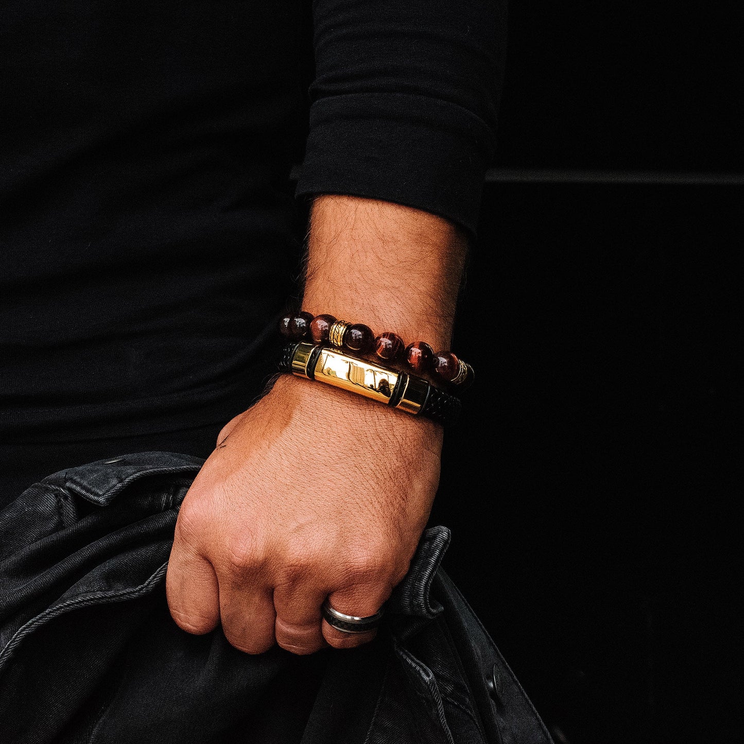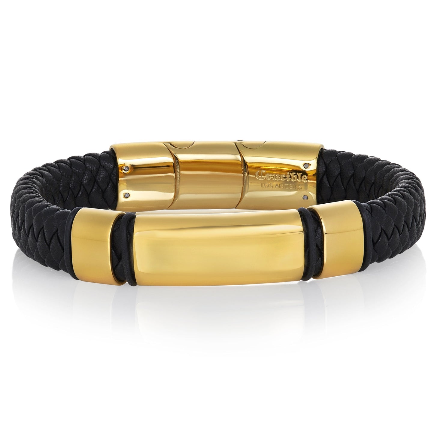 Crucible Jewelry Men's Polished Gold Plated Steel ID Leather Bracelet- 8.25" + 0.5" Ext