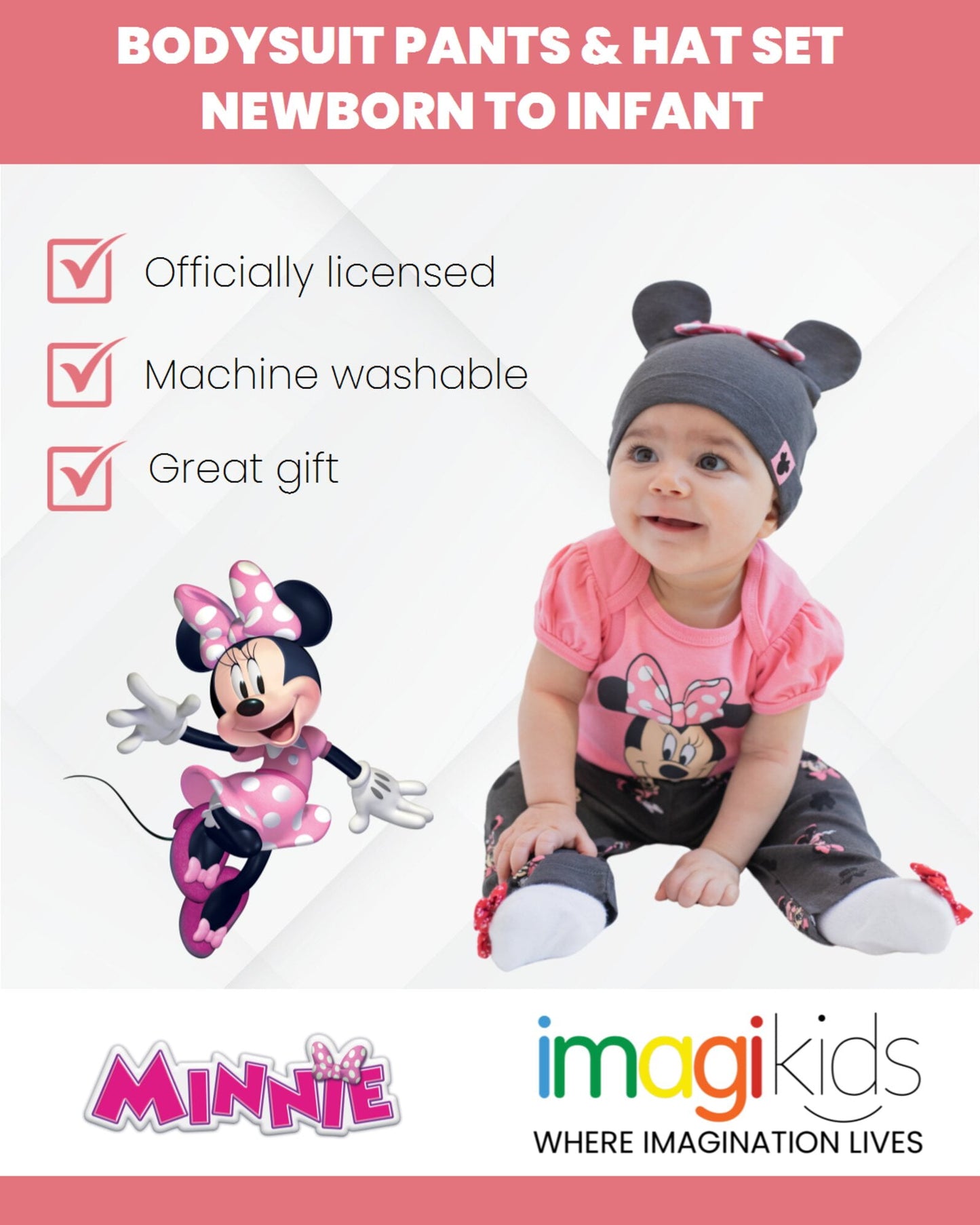 Disney Minnie Mouse Infant Baby Boys or Girls Bodysuit Pants and Hat 3 Piece Outfit Set Newborn to Infant
