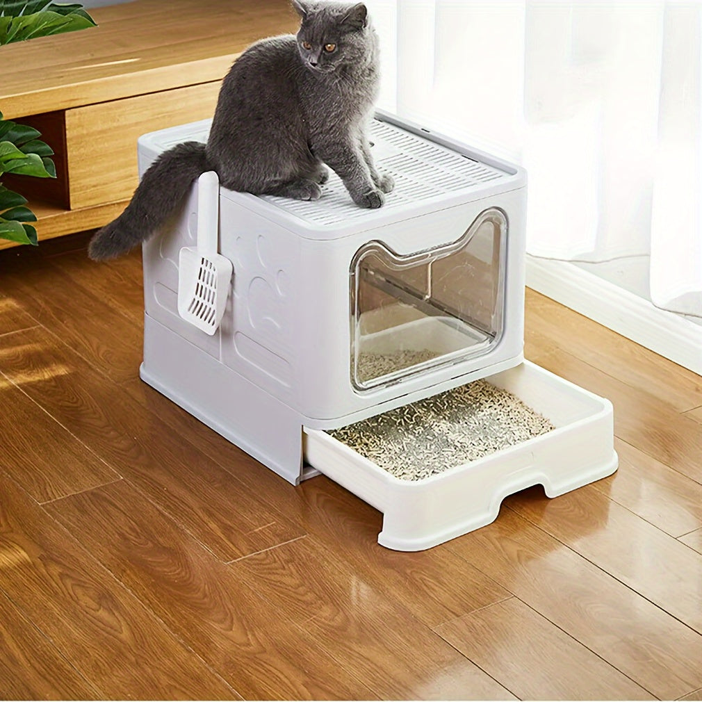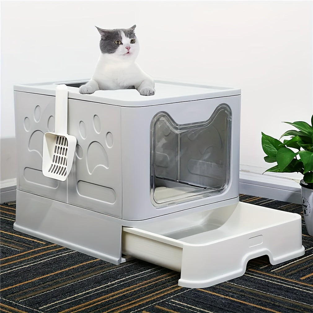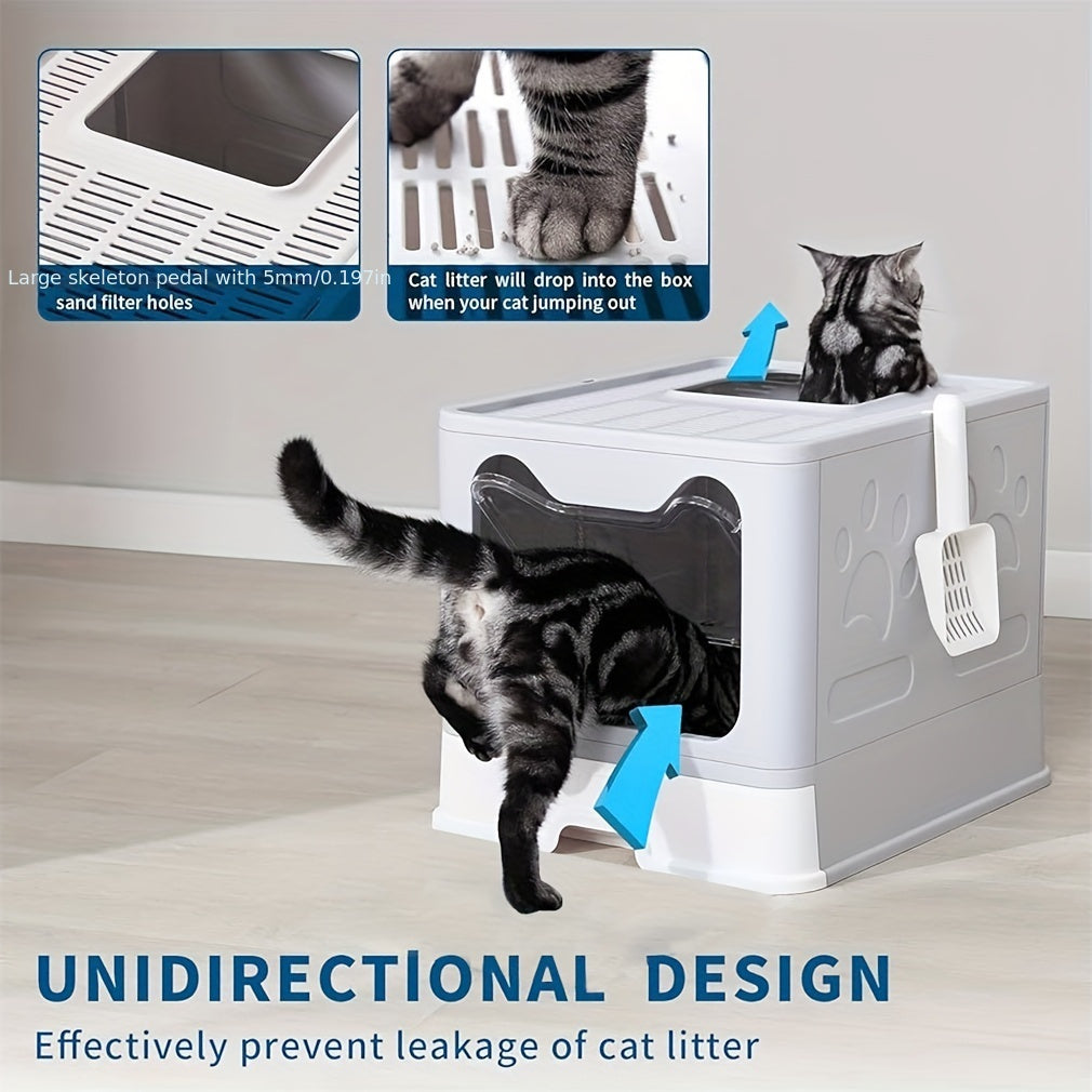 [Durable Build] Odor-Control Cat Litter Box with Tray & Scoop – Space-Saving, Hygienic Pet Toilet for Cats up to 22 lbs, Grey and White, Easy Clean Design