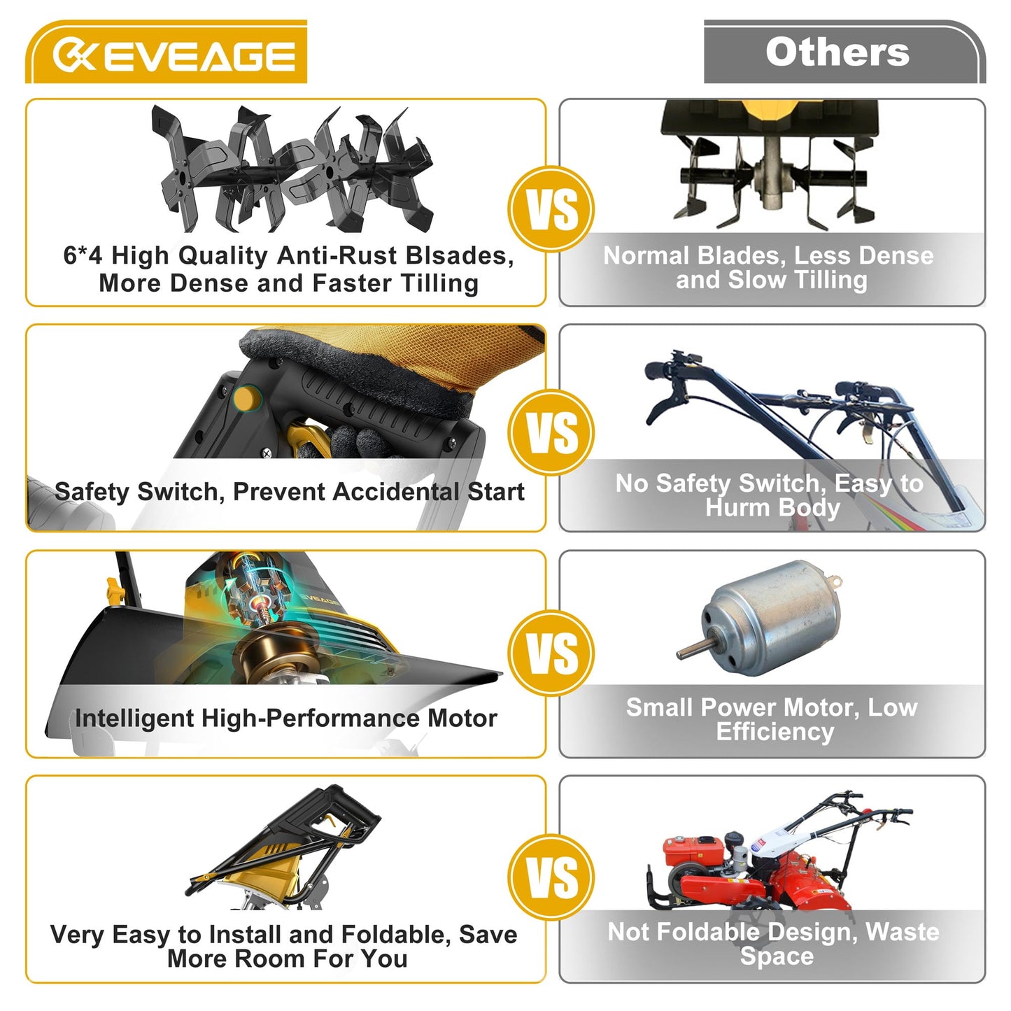 【Durable Materials】 EVEAGE cultivator is composed of a metal frame, a motor and metal blades, totally. High-quality metal frames are not easy to bend. The powerful motor ensures stable power output. The manganese steel blade covered with a waterproof coating can withstand the test of rust and greatly prolong the lifetime.