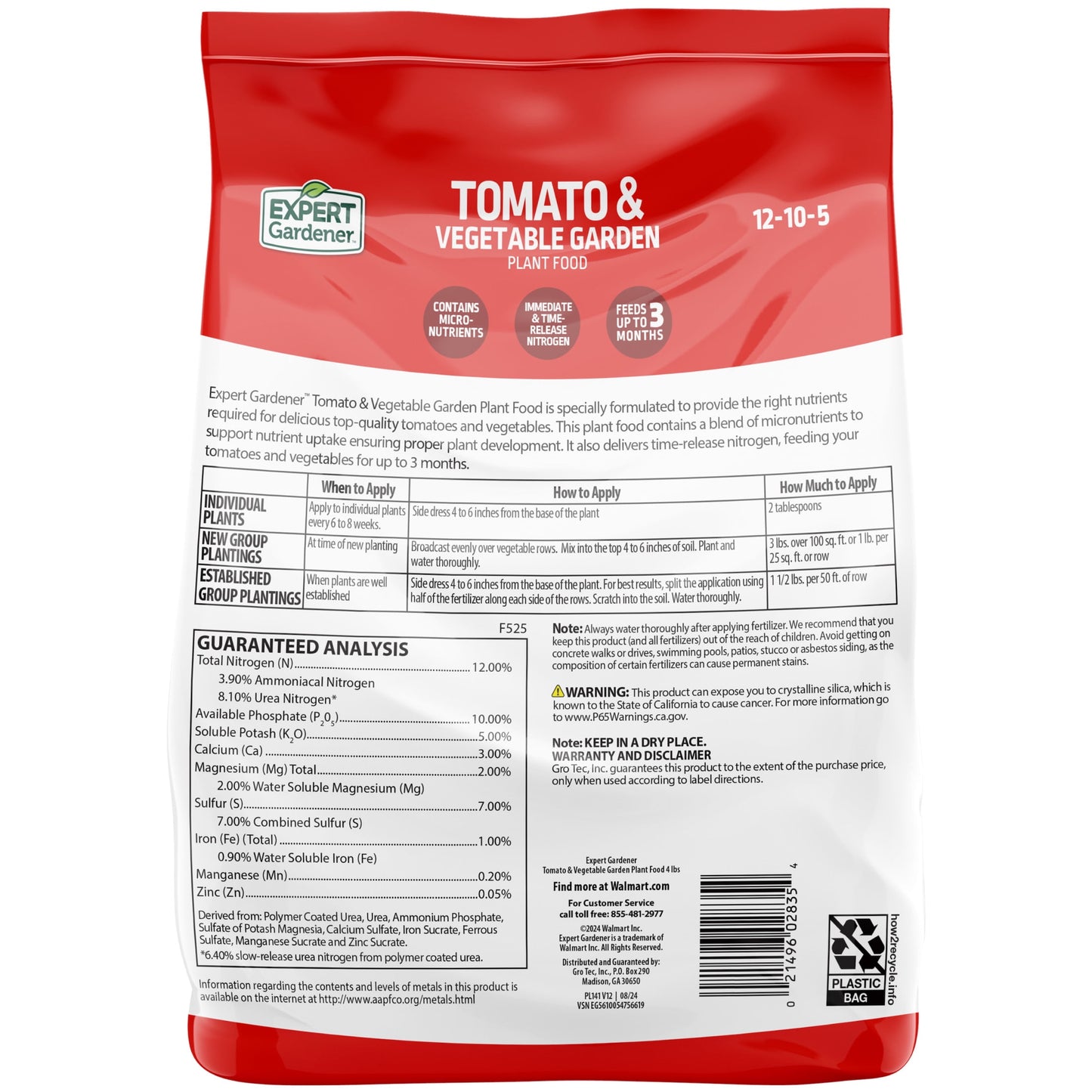Expert Gardener Tomato & Vegetable Garden Plant Food Fertilizer 12-10-5 4 lb. contains a slow release nitrogen formula that feeds for up to 3 months. In addition to customized macronutrient levels of Nitrogen, Phosphorous, and Potassium targeting all types of Tomatoes and Vegetables this fertilizer also contains a customized mix of micronutrients such as Calcium, Magnesium, Sulfur, Iron, Manganese and Zinc. The macro and micronutrients in Expert Gardener Tomato & Vegetable Garden Plant Food 4lb, is specially formulated to provide the right nutrients required for delicious top-quality tomatoes and vegetables.