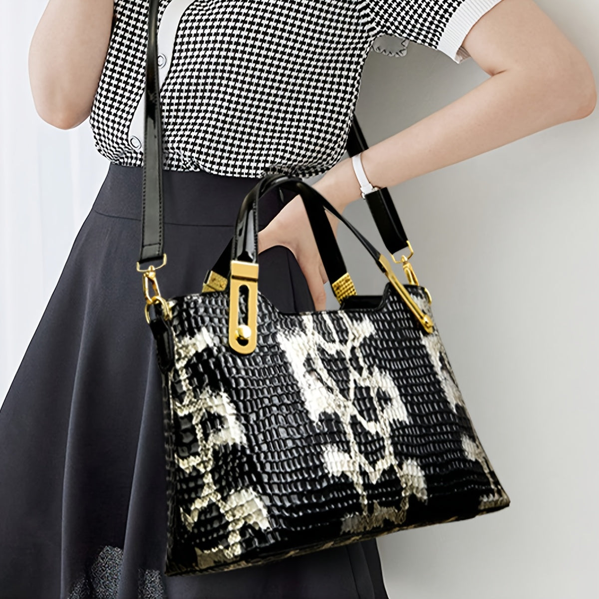 [Luxurious Snakeskin Handbag] Glossy Black & Golden Luxurious Snakeskin Handbag - Large Capacity Tote with Metallic Hardware, Elegant Crossbody Bag for Women, Evening Accessory | Detachable Strap