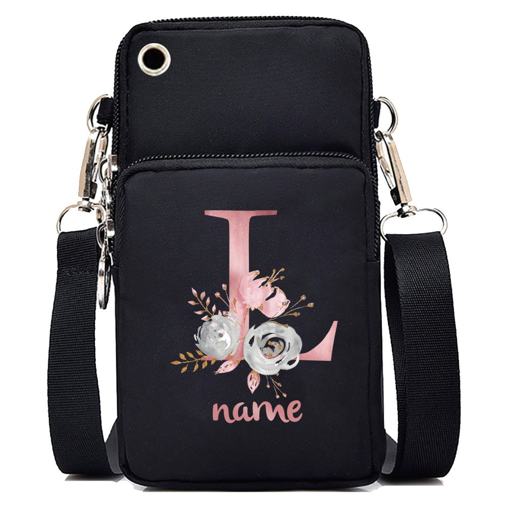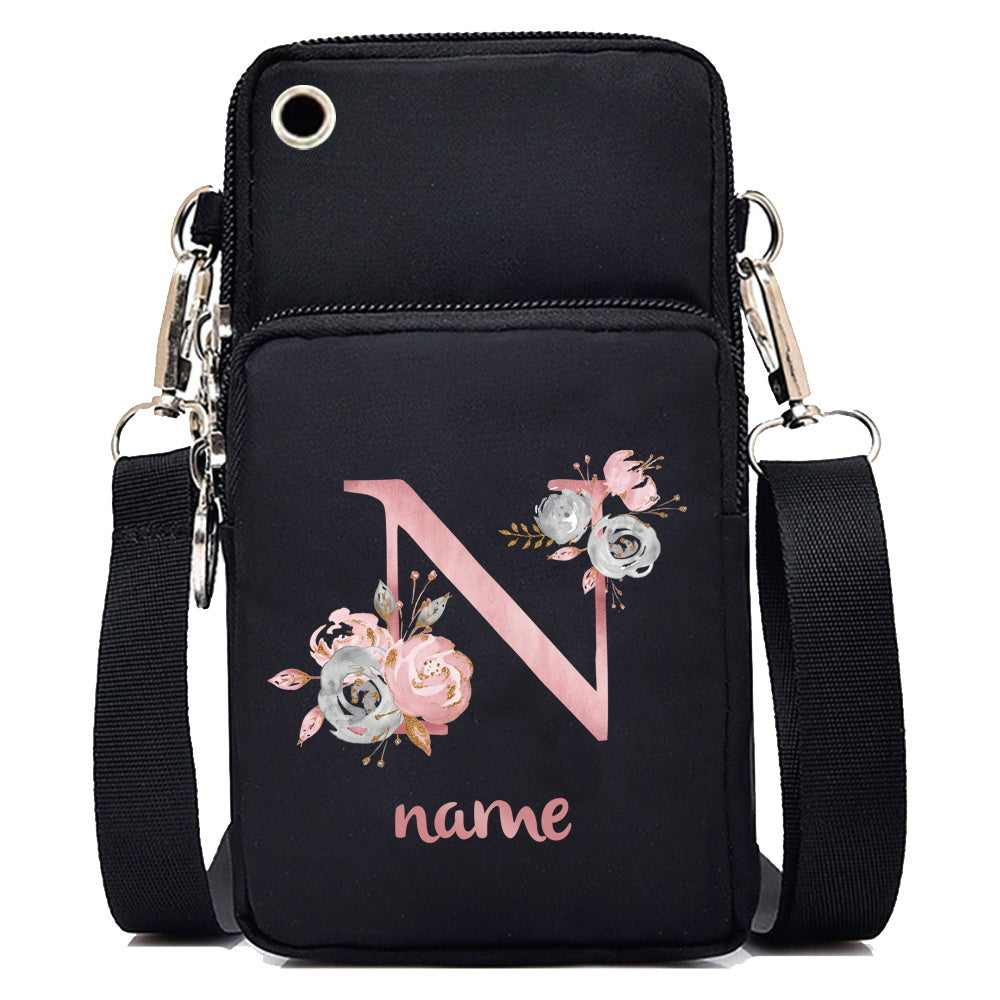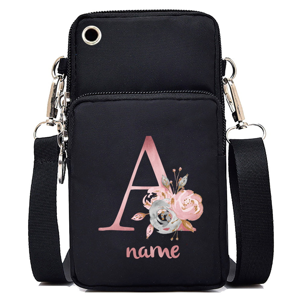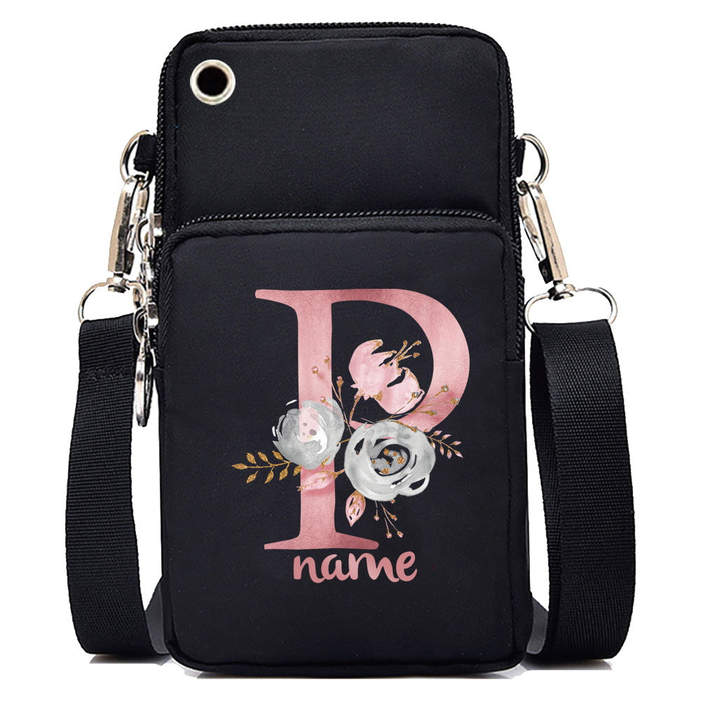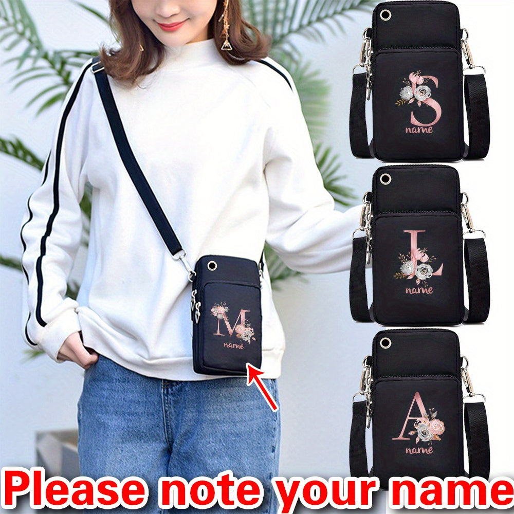 Personalized Nylon Crossbody Bag for Women, Custom Name, Black, Waterproof Wristlet Shoulder Coin Purse, Mobile Phone Pouch for iPhone Samsung Xiaomi, Unlined, Hand Washable