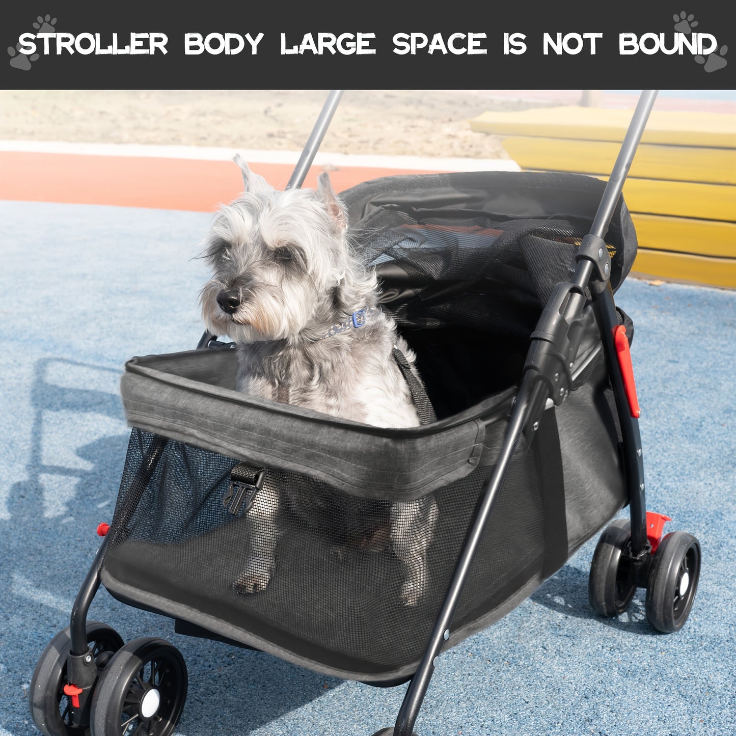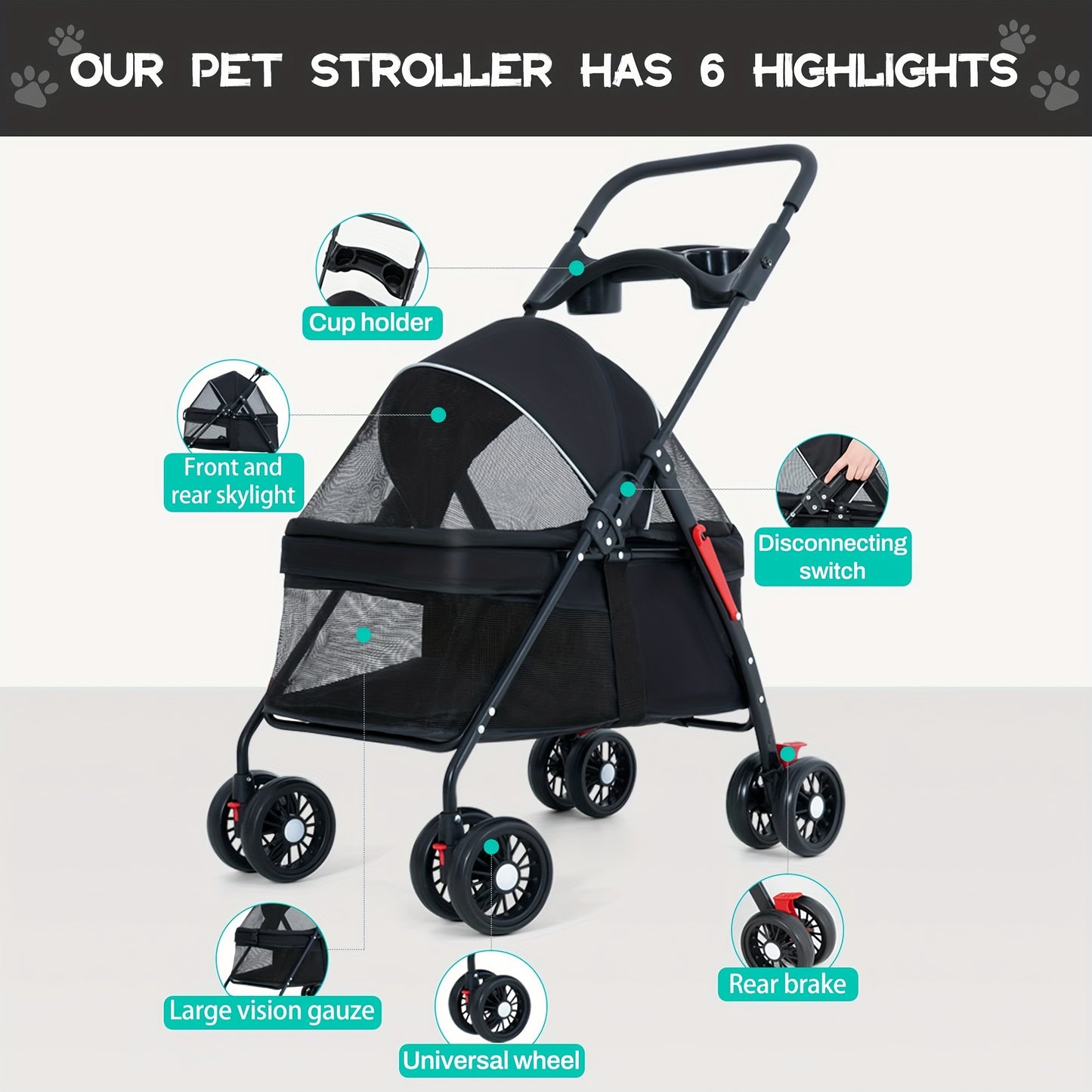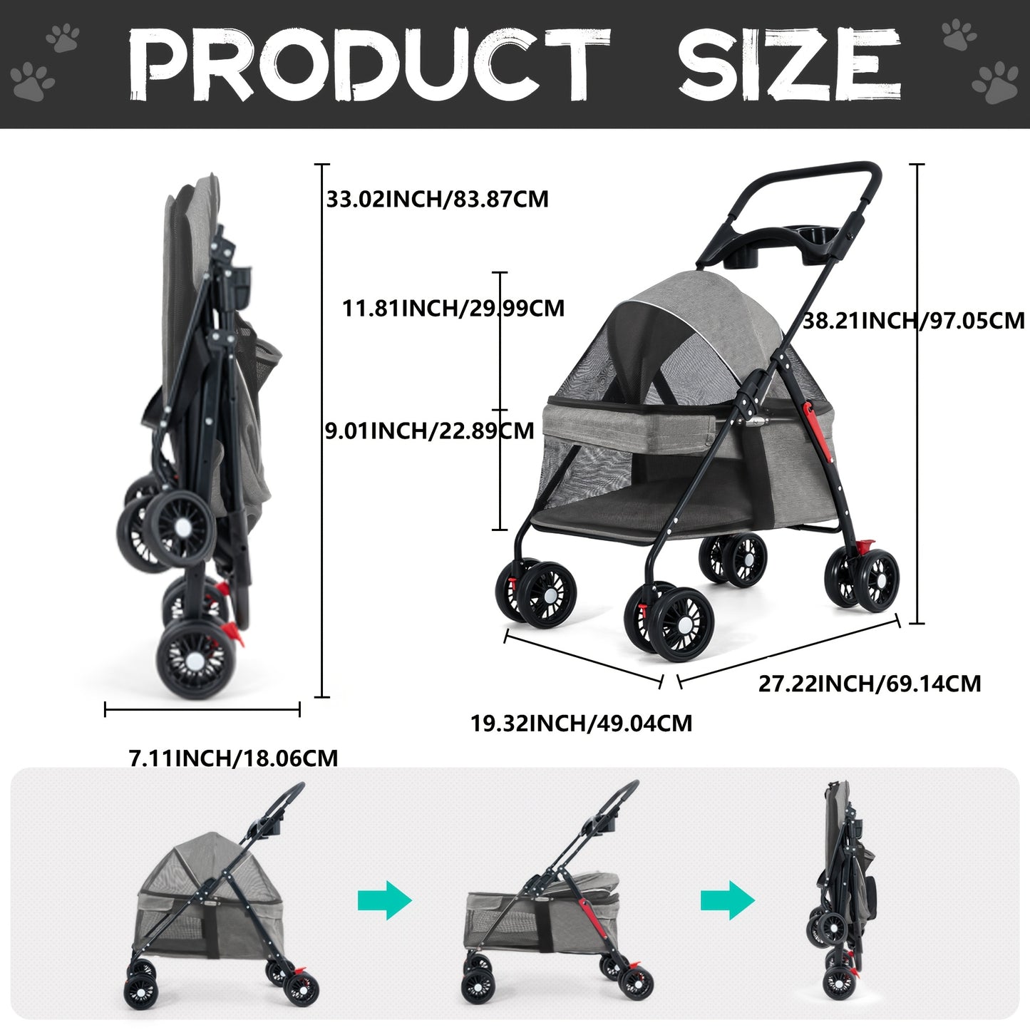 Pet Stroller 4 Wheels Dog Cat Stroller, Pet Folding Stroller, Foldable Dog Cat Cage Jogger Stroller with Storage Basket and Cup Holder, Breathable and Visible Mesh for Medium Small Dogs Cats