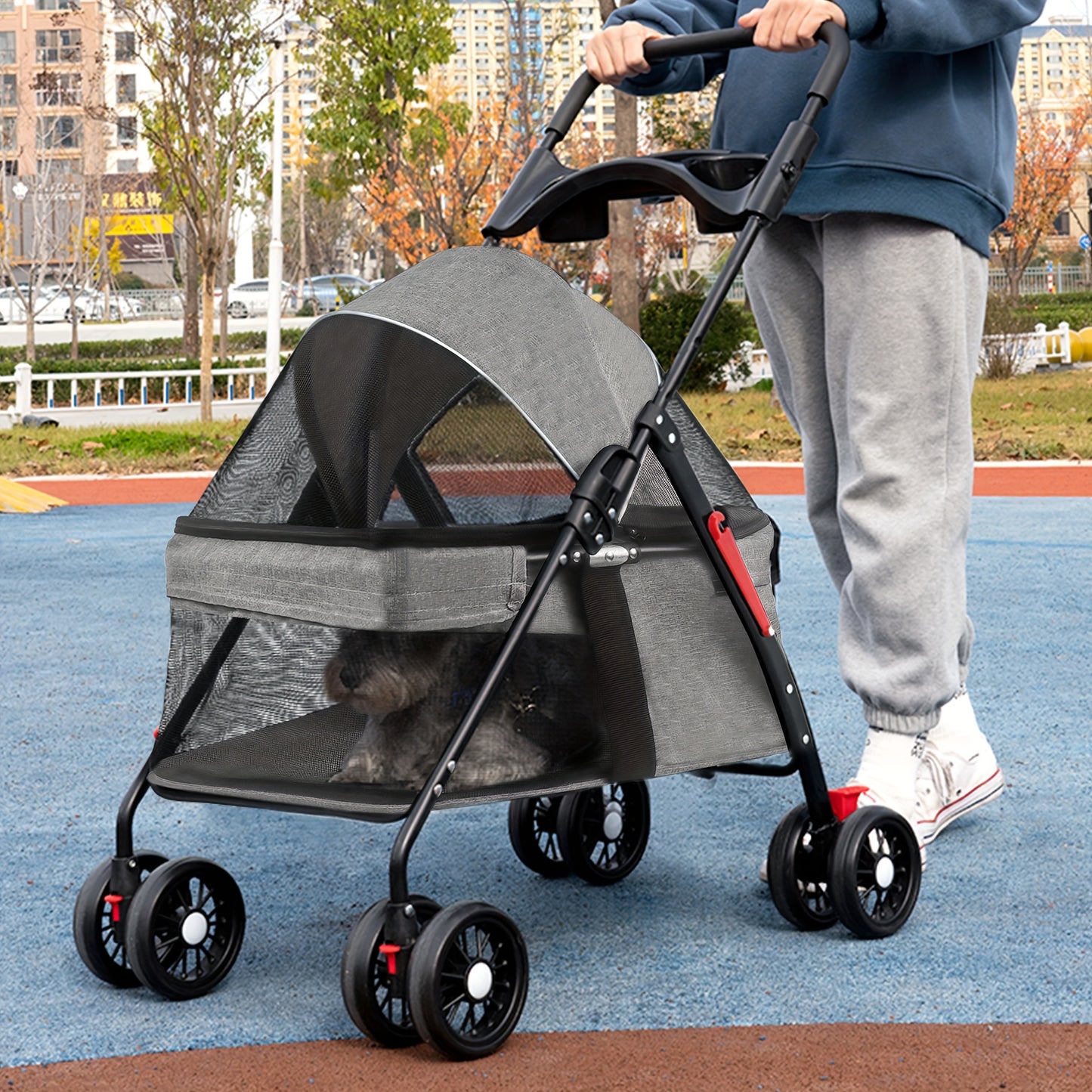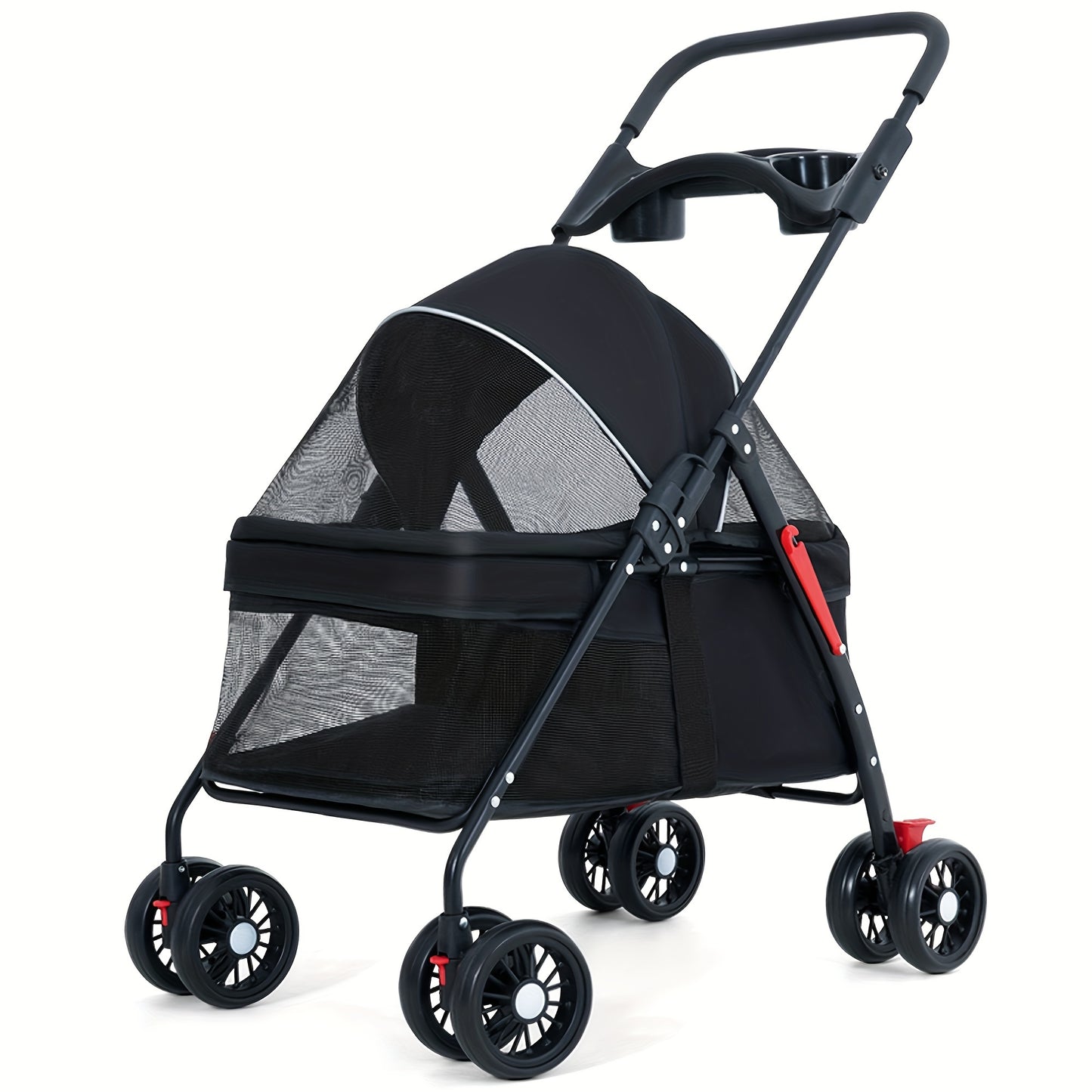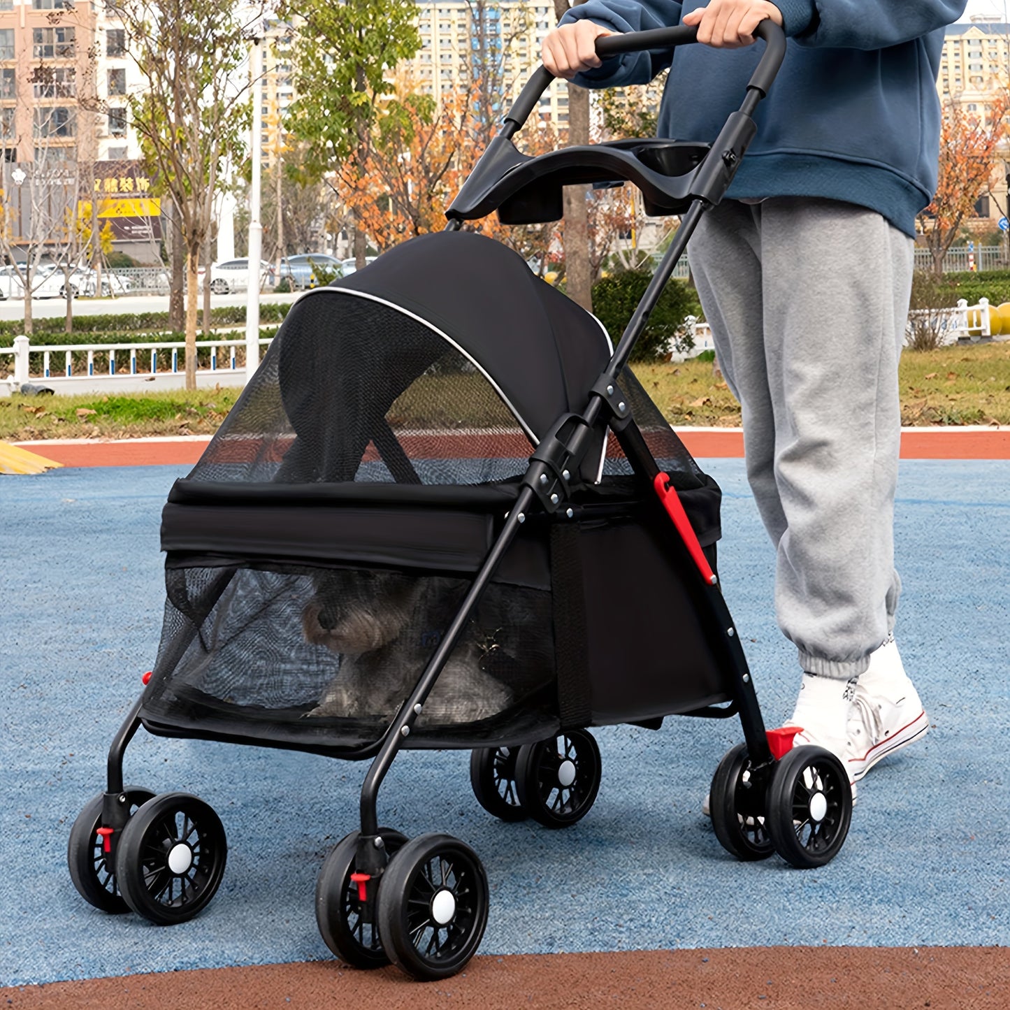 Pet Stroller 4 Wheels Dog Cat Stroller, Pet Folding Stroller, Foldable Dog Cat Cage Jogger Stroller with Storage Basket and Cup Holder, Breathable and Visible Mesh for Medium Small Dogs Cats