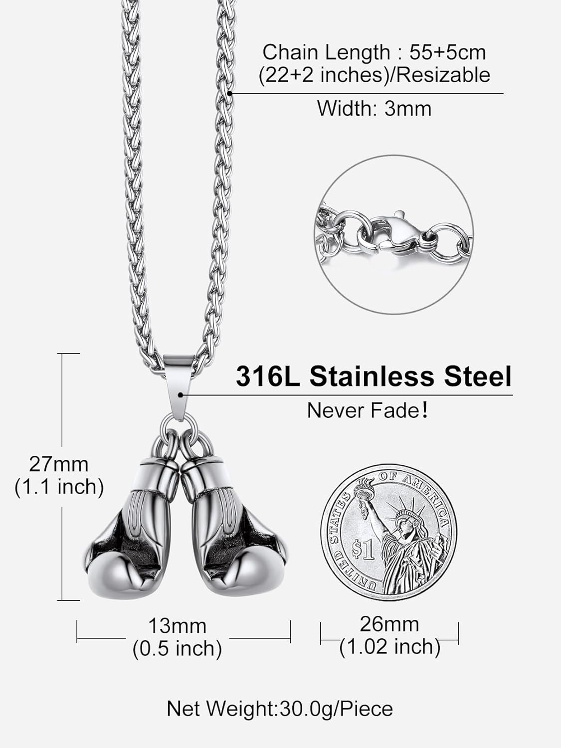 Dimensions: Pendant size: 1''*0.5''; Chain length: 22''+2''(Extended); Lobster clasp; Weight: 22g