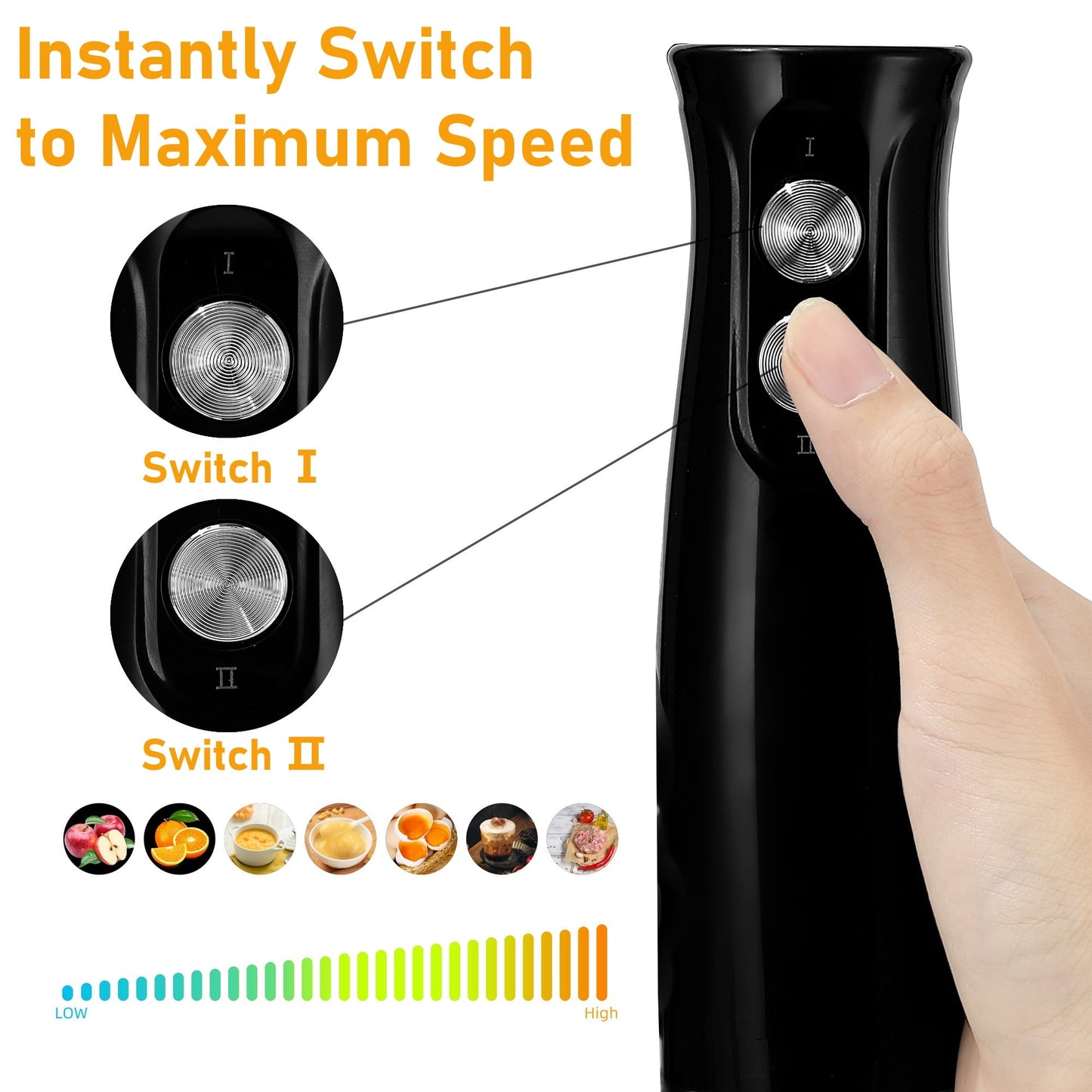 - Powerful Hand Blender: 500w Kitchen blender with adjustable speed and 304 stainless steel blades. You can easily adjust the speed to fit different foods and purposes. Evenly-mixed smoothies, protein shakes, salsas, broccoli soup, and mayonnaise of mouth-watering flavors.