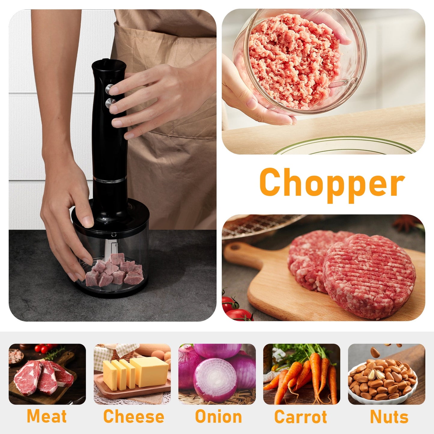 Upgraded 4-In-1 new hand blender customization and ergonomic handle, it makes any recipe or smoothie the easiest cleanup and gives you a unique culinary experience. Including immersion blender, 550 ml chopper, 700 ml beaker, milk frother, blade shape chopper blade, and egg whisk. A variety of attachments can not only meet your needs for the variety of foods you make but also improve your cooking skills.