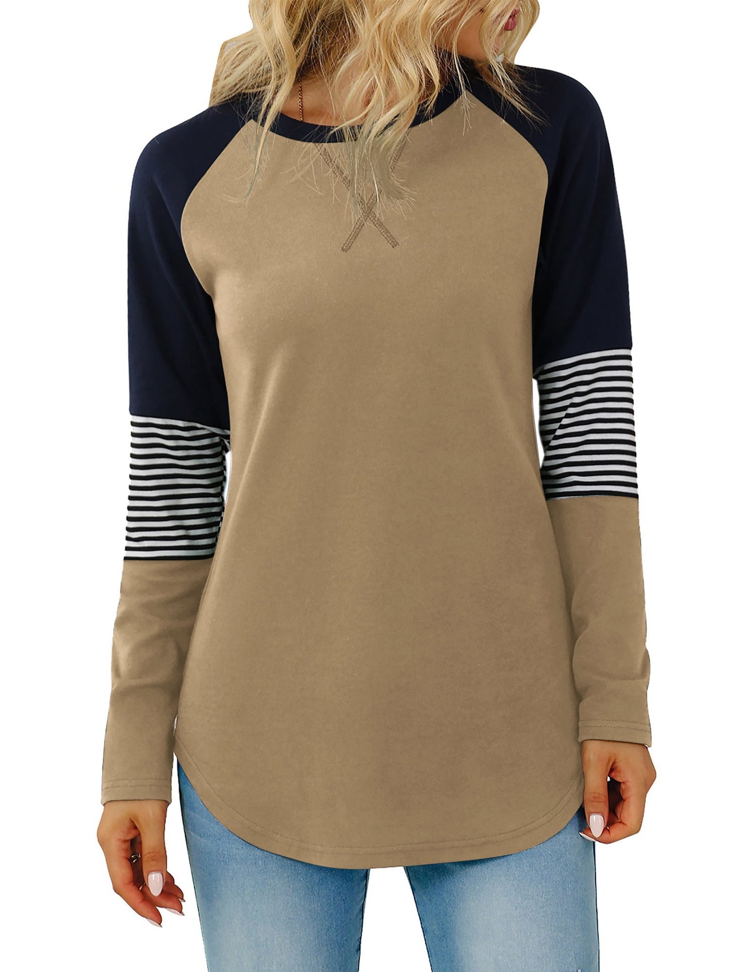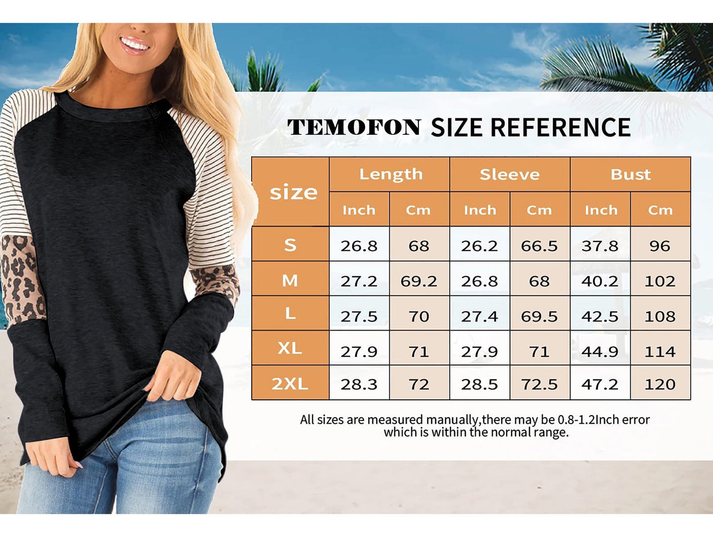 TEMOFON Long Sleeve Tops for Women Casual Fall T Shirts Crew Neck Loose Tunic Tops Color Block Stripe Leopard Print Sweatshirts Black