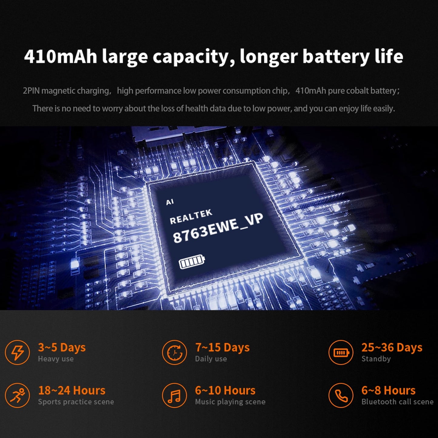 - 【Long-lasting Battery and User-friendly Charging】: - Empowered by a 410mAh high-capacity pure cobalt battery, coupled with advanced low-power consumption technology, the watch ensures extended usage without the need for frequent charging interruptions.